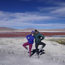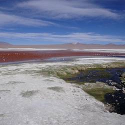 Die Salzwüste haben wir hinter uns gelassen, nun sehen wir Seen mit Flamingos, blau wie der Ozean, von weißem (irgendwas mit Lauge) und grünem Strand umgeben, im Hintergrund Berge und Vulkane, deren Aufbau bandförmige Linien erkennen lässt: braun-rot-hellgrün... Danach mehr Flamingos, so nah, dass man die gelben Schnäbel sehen und die grellpinken von den rosaroten Federn unterscheiden kann. Fotogen stellen sie sich gemütlich auf ein Bein und warten darauf, abgelichtet zu werden. Im Jeep tuckern wir über holprige Straßen immer höher (naja gut, „holprig“ ist hoffnungslos untertrieben), sind überwältigt von natürlichen Steinformationen, die da einfach so in der Gegend herumstehen (man würde meinen, jemand hat einfach einen Baum aus Stein wachsen lassen) sowie vom Schwindel der uns erfasst, sobald wir auch nur beginnen, einige dieser Formationen zu erklimmen. Die Höhe macht etwas Kopfweh, aber das lässt die Stimmung nicht trüben - ebenso nicht der Wind, der uns beinah umbläst als wir auf die letzte Anhöhe und damit das Highlight für heute gehen. Vom Ausblick auf diesen roten See, in dem Flamingos (trotz der äußerst giftig wirkenden Farbe) herumpicken, kann ich gar nicht genug kriegen. Sowas (oder auch nur sowas ähnliches) hab ich in meinem Leben noch nie gesehen!!