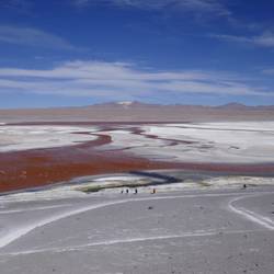 In gedrückter Stimmung quetscht sich der Rest von uns in die zwei verbleibenden Autos und verspätet düsen wir los. Erster Stop sind die Geysire, geplant wäre ein Sonnenaufgang dort gewesen - die Sonne steht aber bereits hoch am Himmel. Beschwerden? Kein Mucks. Von niemandem. Andächtig bewundern wir die Dampfsäulen und hoffen indes inständig, dass es unserem Mitreisenden besser geht und er dies alles übersteht (ja, besonders Franz und ich machen uns echte Sorgen). Dennoch beeindrucken uns die blubbernden Löcher und teufelsartig Dampf spuckenden Spaltenim Boden zutiefst, und wir sind uns nicht ganz sicher, ob uns derer wegen oder wegen der 5000m Höhe die Luft fast wegbleibt...