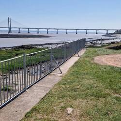 Excellent night's sleep in The Rose beer garden. No lights, no compressors and lots of space. Up early at 06:30, away at 08:15. A local directed me to a toilet in the side of the village hall open 24/7 that I was able to use. Retraced the half mile back to sea wall. Overcast and very strong cool wind so jacket, gloves and balaclava. Sea wall gradually reduced in height as land height increased. After 4 miles path diverted off sea wall to walk around military firing range. Then on lanes over M4, passed Rogiet and Caldicot and alongside the railway to the Severn Tunnel. Back over the M4 to regain the sea wall, by now modest in height. Path then followed a narrow road alongside and south of the M4. Here I met a Traffic officer car which had come off the eastbound carriageway, driven under the bridge and was rejoining the westbound carriageway. So that's how they do it! Walked under the Prince of Wales bridge then a gentle ascent passed a number of dog walkers to Sudbrook point. A cliff of over 10m so no need for a sea wall here.