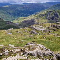 Then through woodland before breaking out to an open track approach towards Cnicht. Temperature was hot by now. Derek had recced a short cut near here yesterday which had proved wet and overgrown. A reason why it is worth following long distance paths, they seem to be better maintained.
