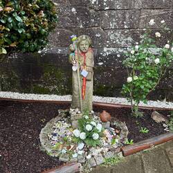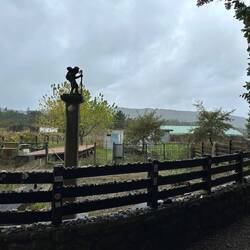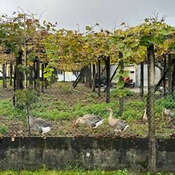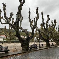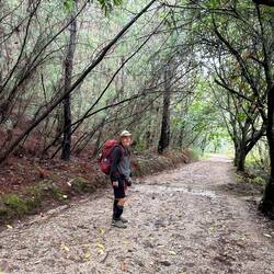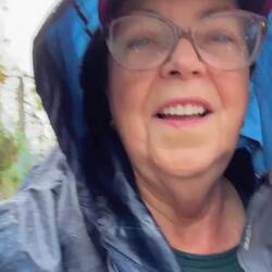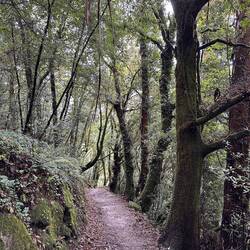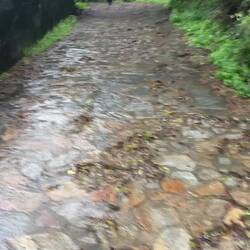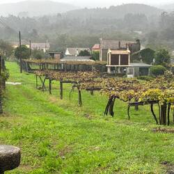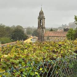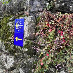 We left Caldas de Reis under a heavy cloud cover with hopes that the rain would hold off. It started sprinkling right away and by the end of the day we had high winds and a downpour- hard rain for four solid hours. No big deal for us at this point because our goal is at hand and we are almost there! Today was different because we made no church visits/ not a single one! Everything is closed up tight with this weather and we are trying to be content with just admiring the exteriors of some pretty amazing churches as we walk by them. Pretty disappointed though! We spent a fair amount of time in the forests again but also on small country lanes and through vineyards. We stopped for lunch at a small café and had a delicious traditional Galician soup with turnip greens, quail with fries and some whitefish with potatoes and peas all for 11 Euro. It was filling and just what we needed to warm up a bit. When it was time to put our ponchos on and head out everyone in the restaurant tried to dissuade us from leaving in the weather- it was getting darker and colder at this point but we knew we needed to keep pushing forward- no taxi for us!! Despite the grey day we saw lots of flowers along the roads- this rain is greening up the countryside. There are lots of pilgrim spots as we pass through and Rick left his rock from Florida at a memorial site today- very moving. We try and pray some as we march along but honestly today was just a day where we tried to survive the elements. The wind was roaring , reportedly with 45 mph gusts, and pushing us along- it took a lot of concentration to place our feet safely with the wind blowing so hard. After 18 miles it was a relief to see our alburgue come in to sight. There was a pilgrim’s meal there tonight. Rick opted out but I went and it was so special to visit with other pilgrims and hear their stories. I know Uischi from Germany and Sanda from Slovenia already but tonight I met Deidre from the Baltic coast of Lithuania and Charles from Québec and a bunch of others who generously sang Happy Birthday to me at our table when they heard i had just turned 67- I almost cried it was so sweet. (And our meal a veggie curry was delicious too.) Going to sleep good tonight!