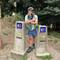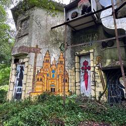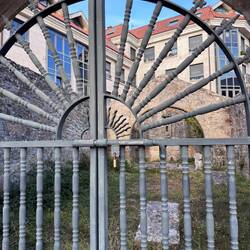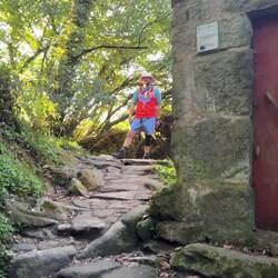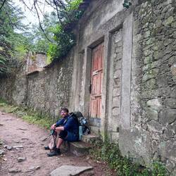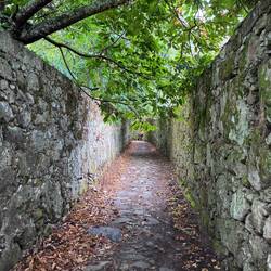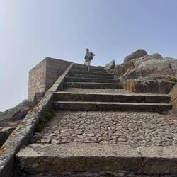 As we walked we were treated to magnificent views of the Pontevedra estuary because from up high it’s just beautiful. We were about to be much higher though because now the climb up Mount Redondo began! It was quite an experience but there was lots of pilgrim themed paintings/graffiti and lots of shell displays to distract us from the pain. Twice when it was almost unbearable, a donativo popped up and we helped ourselves to cold water. And then it started raining again but we were grateful for the overcast skies. At one point we were passed by a cute family- mom, dad and 2 boys around ten years old. They had matching Camino tshirts and looked so adorable but I was puzzled that something wasn’t quite right. We exchanged greetings and I told them what a beautiful family they had…. But something was amiss and I couldn’t quite figure it out but Luke did! He asked me if I had seen that the dad was wearing 4 backpacks! He had one on his back, his front and 1 hung from each each arm- I guess I was delirious from climbing and missed that! Poor guy! When the climb was over we had gained 2000m in altitude and possibly sweated off 5 pounds! We caught our breath so we could enjoy the Miradouro do Loureiva, a scenic overlook, but since there’s no rest for the weary we kept going on a slight incline which leveled off periodically on a dirt path for another couple of miles until the Monasterio de Armenteira ( built in the middle of the 12th century!) finally came into view.