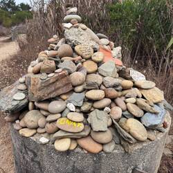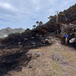 We passed a pilgrims rock pile that had grown sizably since the last time I was here. Many pilgrims bring rocks from home and leave them in places that inspire them to leave their troubles (their rock is symbolic) here in Spain before “meeting” St. James in the church of Santiago de Compostella at the end of their Camino. Moving on- in Pedra Rubia it’s always a good idea to stop at the O Muiño campground. There’s a windmill to see and fresh orange juice and pain au chocolat- It never disappoints! Walking the path you get good views of the Silleiro lighthouse while hoping not to have to climb up there. You just never know where the path will lead- just follow those shell markers and yellow arrows! In As Mariñas usually we divert up to the right and climb significantly. I was dreading the climb a bit but once we reached the Portilla I stopped in my tracks- it was burned so badly! I had heard about the fires in the central areas but fire had reached down this low too. I took a picture of the gate and then looked back to last years pictures and was so sad to see the damage the fires had done- I’m praying the area can recover and grow back. There were men with chainsaws trying to clear and so we pivoted and hiked back to the road to finish getting down to our destination-Baiona.