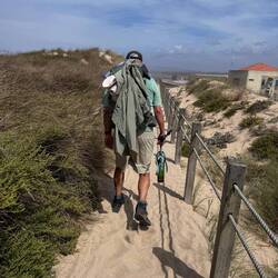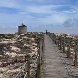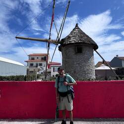 Our walk to Esposende today was basically flat as we hugged the coast and dodged lots of vacationers enjoying these last few days of summer. There were many happy people out enjoying the beaches and the little cafés. We were waved to and greeted with “Bom Caminho” by people strolling or biking- it felt so good to be welcomed like this! Several of the villages we passed are celebrating end of summer festivities so there were lots of lights hanging and flags and streamers strung up. Today was another one hiking on the boardwalks until end of afternoon when we walked on some dirt and gravel roads and passed small vineyards, fields of corn and trees heavy with apples. Earlier in the afternoon we passed the masseiras which employ unique agricultural methods including seaweed fertilizer and troughs dug deep in the sand- seeing farmers with tractor loads of dried seaweed was certainly interesting and different! There were ancient windmills to see and several pristine soccer fields and then a random golf course/ we saw handmade pilgrim shell displays and rock piles- surprises were everywhere today! We are getting our credentials stamped at churches we pass and there were some beautiful ones on our path especially the Templo do Bom Jesus de Fão and the Capela de Nossa Senhora de Lapa. Entering Esposende we crossed over the Cávado River via the long Ponte De Luis Filipe bridge. I have a blister on my right toe but Luke is going strong- today was 17.5 miles and after pizza in the charming town square we are headed to sleep-Read more