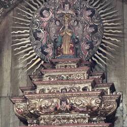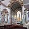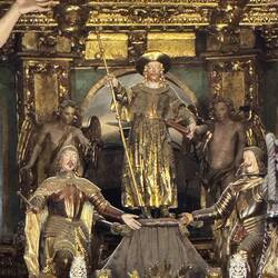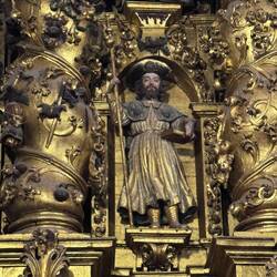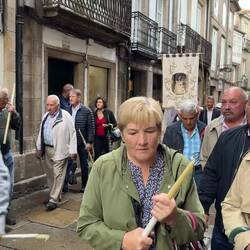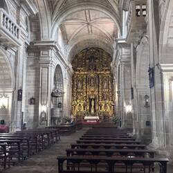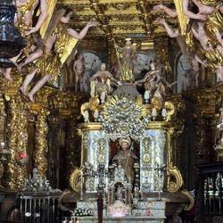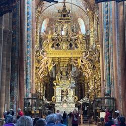We visited the Praza do Obradoiro again this morning to see it in the daylight, to admire the west facing façade of the Cathedral and to see the Portico de Gloria. The square was packed with pilgrims and tourists and we took more pictures especially of St James way up high in the central tower. We made our way around the church to the Praza das Praterias (silversmiths), saw the huge fountain of horses and climbed up the steep steps to the south door which is so ornately carved. It’s here that we lined up for Mass. Once we entered, the awe and delight of our visit peaked because the cathedral is sumptuously decorated from the exterior to the fabulous interior. We were amazed at the gold altarpiece resplendent with statues of huge cherubs and St. James and his disciples. The massive organ, art and carvings and painted columns were a visual treat. Pictures just don’t do the golden display justice. Today there were three priests saying Mass and a nun with a beautiful voice up front who led us in song. There were confessions being heard in the chapels on each side of the church so we took advantage. We lit candles and murmured our intentions to be sent up with the prayers from the rest of the pilgrims who were doing the same.