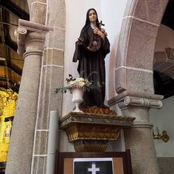 Last night I slept so deep- I was tucked in a cubby with my curtains pulled and I heard nothing until 10am when I opened my eyes to full sunlight and a panic- oh my goodness I never slept so late on a Camino! Luke was asleep too and all the other pilgrims were gone- what a pair we are!! We roused and got backpack and boots together and were out the door as quick as possible and on the road! And then we were in a church within 3 minutes of our hostel- it was the beautiful Igreja da Misericórdia where there was a small altar to San Tiago- a good way to get the day back on the right foot! On the way out of Esposende we passed the memorial of Homem do Mar and the São João Baptista fort and then we ambled through small villages full of houses with red tile roofs. We were greeted by numerous little dog and cats who made sure to let us know they saw us! The day was clear with blue skies and cool breezes- so pleasant and calming. We stopped at a grocery store in Marinhas and bought apples and peaches and protein bars, visited the village church San Miguel and kept going. We visited many churches and chapels today- one had the most beautiful statue of St Thérèse that I’ve ever seen and so I felt my mom with me today! The people in Portugal have a devotion to Our Lady of Fatima so each church has some type of statue or painting of Mary clothed in white as she was described at her miraculous appearances. The flowers on the road were not as plentiful as in the springtime- this has been a hot summer- but the ones we saw were stunning- bougainvillea, oleander, sunflowers and purple morning glory seemed the most plentiful. We entered the eucalyptus forests again and were on rocky paths. I find it amusing that even though you are far from the villages and people, there are still donativos- unmanned booths with goods or snacks for sale- that pop up randomly! Luke bought me a shell bracelet today and we got some fruit and a pain au chocolat too at another one. We stopped in at the O Lampio bar for a soda and were treated to honey and jelly crackers and peanuts- the owner there has done the Camino many times and he’s super kind to pilgrims. His place is jam packed with soccer memorabilia and everything else you could imagine- eclectic to say the least and a must stop! We crossed a thin bridge of concrete blocks over a small waterfall and considered dunking our feet but there were miles to go so we hiked on. From time to time we ran into our new friends from the hostels and it’s fun to see familiar faces like Virginie from France, Petra from Germany and Aimée from Canada. We see lots of families with young kids. Today we met a mom with her 15 year old son and when I shared that Luke and I were mother and son on the same journey we had a sweet connection! 💕 Further up the road in Castelo da Neiva we visited the small church only to find it full of flowers and some ladies working on a float with Our Lady and baby Jesus featured prominently up top. Apparently this Sunday they celebrate the Festa de Nossa Senhora de Guadalupe and there will be parades and men will carry this float/ platform- I wish we could see it being carried because it certainly was lovely! A little further on we visited their large parish church of St James ( San Tiago) which has the distinction of having a remnant of stone that proves a devotion here to St James from the year 863! The woods gave way to farmland soon after and we saw goats, sheep and chickens while we walked on cobblestone streets again. In Anha the church was striking - whitewashed in the Portuguese manner with St James in the niche up top, a painting of him on horseback carrying a shield with a red sword just below that and finally some marvelous front doors with shell decorations- lovely!! Arriving into Viana do Castelo at sunset topped off a long hard beautiful day with a ton of hiking- 18+ miles! This morning may have started with a flourish but the day ended with sore feet and lots of good memories. For now we are tucked into the Albergue De Santa Luzia high up top a mountain above the sea and thanking God for our safe arrival and looking forward to tomorrow and new adventures.Leer más