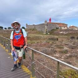 Our walk to Esposende today was basically flat as we hugged the coast and dodged lots of vacationers enjoying these last few days of summer. There were many happy people out enjoying the beaches and the little cafés. We were waved to and greeted with “Bom Caminho” by people strolling or biking- it felt so good to be welcomed like this! Several of the villages we passed are celebrating end of summer festivities so there were lots of lights hanging and flags and streamers strung up. Today was another one hiking on the boardwalks until end of afternoon when we walked on some dirt and gravel roads and passed small vineyards, fields of corn and trees heavy with apples. Earlier in the afternoon we passed the masseiras which employ unique agricultural methods including seaweed fertilizer and troughs dug deep in the sand- seeing farmers with tractor loads of dried seaweed was certainly interesting and different! There were ancient windmills to see and several pristine soccer fields and then a random golf course/ we saw handmade pilgrim shell displays and rock piles- surprises were everywhere today! We are getting our credentials stamped at churches we pass and there were some beautiful ones on our path especially the Templo do Bom Jesus de Fão and the Capela de Nossa Senhora de Lapa. Entering Esposende we crossed over the Cávado River via the long Ponte De Luis Filipe bridge. I have a blister on my right toe but Luke is going strong- today was 17.5 miles and after pizza in the charming town square we are headed to sleep-Leer más
