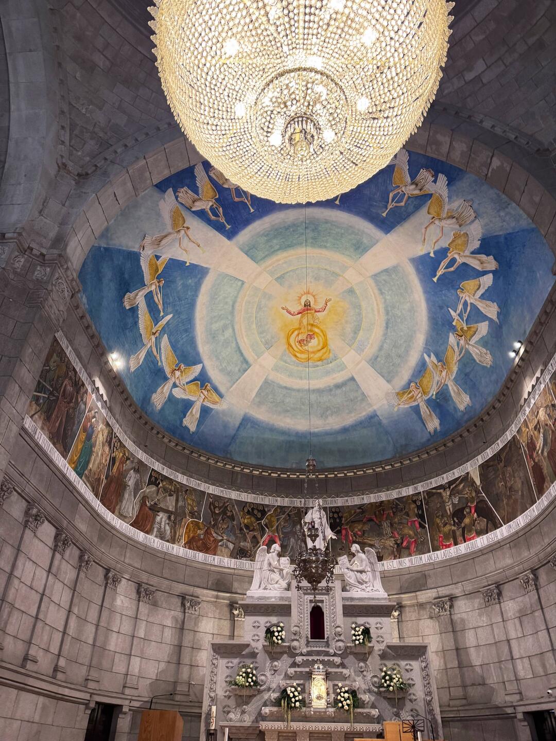 The first site on my agenda was the Igrexa da Virxe Peregrina, the Sanctuary of the Virgin Pilgrim. The church is built in a unique shell-shape and with the statues on the facade the effect is truly elegant and breathtaking. It stands in a square that is busy with shoppers and cars but you can’t help but stop and be awed by her beauty. This church is an important stop on the Camino trail because Our Lady is represented as one of us, a pilgrim; and also as our protector on our way. Luke and I were fascinated when we climbed the stairs inside up to the dome- it’s a spectacular view from way up there!
