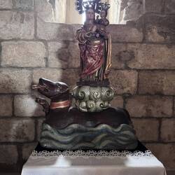 Then it was time to walk the streets of Santiago and explore and eat some snacks and ice cream! We were suddenly caught in a sweep of local folks holding tall candles and pushing past us up a tiny street. We heard music and then, to our surprise, a procession of men solemnly carrying a wooden platform with the statue of Nossa Señora Peregrina decorated with flowers marched right by us. They walked to the beat of the music striking their staffs in a synchronized fashion with one hand and carrying the platform in the other. The band that followed played drums and bagpipes among other instruments and they were dressed in ancient traditional Spanish fashion. I’ve always dreamed of seeing a procession like this!