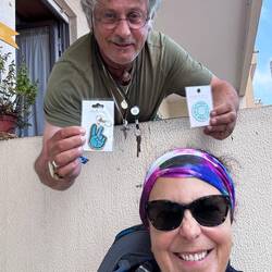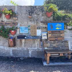 Meeting different people is one of the pleasures and gifts of the Camino and today we met a man named Carlos who sits up on his balcony which is directly on the path and speaks to all pilgrims who pass through. Today was no different- he was there and I was so happy to introduce Luke to him! He’s eccentric acting but so friendly that it’s easily worth a few minutes to chat with him and also he stamps your credential with his personal stamps! No end to the surprises on the Camino da Costa!
