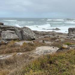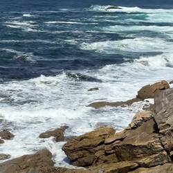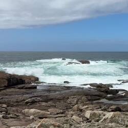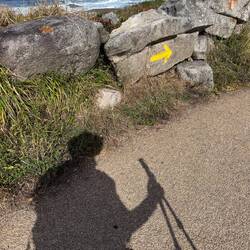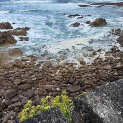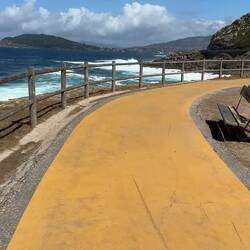 Today was all about walking by the sea. The road took us high and low but always within eyesight of crashing waves on huge boulders and each time we saw a flume of water ascend from the impact of wave on rock it was another thrill. At times the beachy path became impossible for the builders to finish because of trees, tidal pools and boulders, so we’re moved up to the side of the actual road. Luckily there’s a lane painted yellow (a huge yellow arrow to follow!) for us pilgrims. The cyclists were out in force today. We saw several peloton whiz by and even a few pilgrims on bikes. They shout , “Buen Camino” as they blow by us and probably don’t hear when we respond. It’s interesting if another pilgrim greets you with “Buen Camino" you respond with "Buen Camino." If a local wishes you "Buen Camino", you’re supposed to respond “Gracias.” Trying to learn the etiquette here!