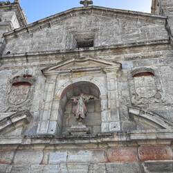 Baiona is so pretty- there’s lots of shopping and people-watching to do here. Our hostel is right across from a beautiful soccer complex and up the boulevard from two churches. We dropped our packs off and made our way to the churches. The first was the Capela de Santa Liberata. Renovations are being done to the main altarpiece that shows Saint Liberata crucified so there was scaffolding in place but it was still amazing to see the intricate carvings and gold leaf. The chapel of Santa Liberata was built in honour of this daughter of Baiona who was martyred by crucifixion. There is a carving of her in the niche up top above the massive front doors also. The next church we visited was an imposing church with a unique rose window of a boat at the entrance. The Igrexa de Santa Maria de Baiona was built in the same fashion as the Monastery in Oia and in the 13th century-very large, grey, somber but full of beautiful art and carving. The statue of Mary saving a drowning fisherman was one of my favorites. On the way out a priest stopped to bless us and we had him stamp our credentials.