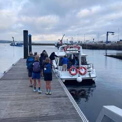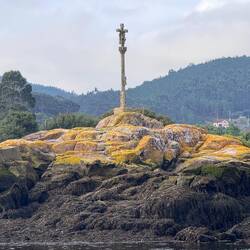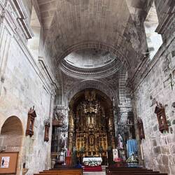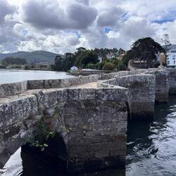 Along the Arousa estuary we landed on a sandy path that bordered three different beaches that had clear blue water and looked so inviting. The sun was shining and we were getting hot so we stopped for a frozen treat to cool us down while we rested our feet. Then it was only a little bit before we were crossing the O Terrón walkway into Vilanova de Arousa. Luke swam on the beach while I put laundry in, checked out the local grocery and stole some time to write. When he was back we visited the beautiful San Cipriano church with the statue of Senora du Carmel who is a patron saint of sailors and went across the street to see the ruins of Capilla de San Mauro from the late 15 century. We watched the sun go down and ended the night with sweet conversations with our hostel roommates. It was a great Camino day- beautiful but a long 15 miles and we have a boat ride in the morning so it’s off to sleep now.Leer más