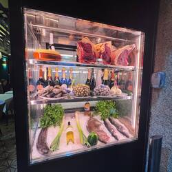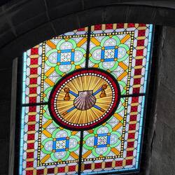 Getting something to eat then was our next priority. Each little restaurant had painted menus posted outside lettered with swirly words in Spanish that invited you inside. Window front shelves of glass were adorned with displays of seafood and fresh cut meat and sausages and sprays of vegetables. Pastry shops with luscious sweets and Santiago tarts in their windows tempted us. There were also a myriad of souvenir shops full of jewelry with shells and crosses, holy medals and rosaries, tshirts and porcelain tiles ready for pilgrims.