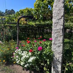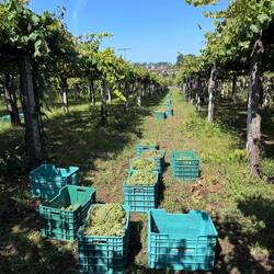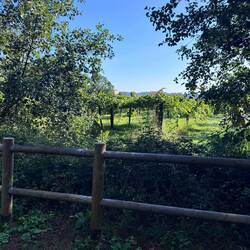 Following the Río Umia we hopped out of the forest and into sandy paths that had us passing through miles and miles of vineyards. It is harvest time and we saw the workers in the vines hard at work picking grapes and loading them in to crates. In some vineyards it appeared that whole families were harvesting their own grapes. I wanted to hang out under the canopies of grapevines but the tractors criss-crossing and the level of industry I saw from the pickers made me tired when all I really wanted was someone to feed me some grapes! Occasionally a field of corn or peppers would pop up but primarily this afternoon it was all about the grape.