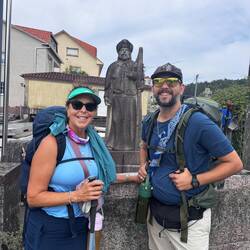 It was pouring rain this morning and that relieved our guilt for sleeping late a tiny bit- we needed it and the rain was really coming down! We had breakfast which was scrambled eggs (they call this an omelet!), a huge piece of home baked bread and some fresh squeezed OJ- perfect to get us going. Once the rain let up a little we set out to explore Vigo a bit before strapping on packs. We headed down to the waterfront which is full of boats of all sizes- there was a large cruise ship moored as well as smaller sailboats. Vigo port is well known for its seafood processing and exporting. We saw the Jules Verne memorial - it’s a bronze statue of JV sitting on an octopus- very cool! He mentions the bay of Vigo in his book 20,000 Leagues Under the Sea and is thought of as an ambassador for the area. Next we visited the old town of Vigo with its many shops and cafés and immediately went in to the Church of Santa Maria, the Cathedral of Vigo, the Igrexa Colexiata de Santa Maria. It’s a large church with short stairs to the front doors that wind naturally around with the flow of the climb and I think they draw you in. The locals call this church La Colegiata and it houses the statue of El Cristo de la Victoria, the Christ of Victory. He’s so named because the town believes his intercession helped them defeat the French in the War of Independence. This statue is paraded in town during a festival in early August each year. There are beautiful mosaics all over the front and sides of the altar wall- we were able to attend Mass there this morning and felt it gave our day a wonderful beginning. We got our credentials stamped and decided to go back to the hotel, get our bags and start walking. Impulsively I left my Keen sandals there at the pilgrims table for another pilgrim. I couldn’t wear them because they shredded my feet and they were too heavy to keep carrying. Actually once I thought of my blisters and Luke recovering I just couldn’t push enough for that long climb out of the city and up Mount Vigo so we took a cab over to the Senda Litoral and started from there. The morning went quickly and we were in Redondela in time for lunch. This town has the Igrexa Santiago de Redondela and the chapel of Santa Mariña. One large, one small, both right on the Camino and a good place to stamp a credential and rest and say a prayer. After lunch Luke went ahead to save his strength and take my backpack while I limped in to Pontesampaio. There were many more pilgrims today since the way has actually begun for people who prefer to only hike the last 100K of the Camino. I met and walked with a couple of guys from Ireland, girls from Germany and Italy, a mom pushing a stroller with baby Margarita and young people from Australia and Toronto. The world seems small when you’re on the Camino! We came to one point where we were given the choice of roads. One had an elevation of 15% and was 70 meters long vs. having an easier climb at 5% elevation change and 369 meters- of course we all chose the hardest one- peer pressure is a wonderful and dangerous thing! The afternoon got hot but it wasn’t long before I made it to Pontesampio with its medieval bridge. The origen of this bridge is Roman but the current bridge dates back to the Middle Ages and it’s still in use today! It was great to see Luke there sitting on the bridge encouraging me in and pointing to our hostel. There’s construction at the entrance to the town so cars are diverted so Luke had to carry in both backpacks for the last mile and a half… not the rest he was hoping for! He’s feeling better though and made a delicious dinner of pasta with cheese sauce for us tonight as I did laundry. It’s an early night (a luxury on the Camino) and we are tucked in getting ready and excited for Pontevedre! The view from my window is the town church and I hear its bells ringing us good night.Leer más