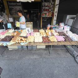 Fortunately, my sweet tooth didn’t suffer for long, because we soon stumbled across an outdoor, evenings-only, bakery stall that sells donuts and mini-muffins for 5 ฿ each. Also fortunately, it was a 1 kilometer walk from our condo, so at least I got a little exercise before stuffing my face with carbs and sugar.