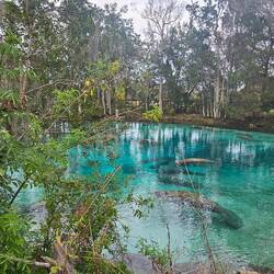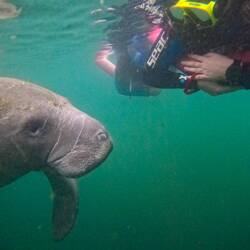 Wir schwimmen im Hundeschwumm (wir dürfen die Füsse nicht benutzen damit wir nicht aus versehen die Tiere treten und liegen daher auch auf einer "Schwimm-Nudel") weiter Richtung Quelle. Dort wird das Wasser kristallklar, und ich kann endlich alles sehen. Es sind so viele Manatees! Es ist ein atemberaubender Moment, als ein junger Manatee neugierig auf uns zukommt, mit uns interagiert und sogar anfängt zu spielen.