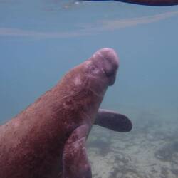 Das Tier schwimmt direkt vor uns, stupst uns absichtlich leicht an, fast wie ein kleines Küsschen ins Gesicht, dreht sich dann auf den Rücken und berührt uns mit seinen Flossen. Es wirkt fast so, als wollte es uns dazu auffordern, seinen Bauch zu streicheln. Doch wir halten uns alle daran, das nicht zu tun, da das die Tiere zu zahm und aufdringlich machen könnte.