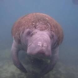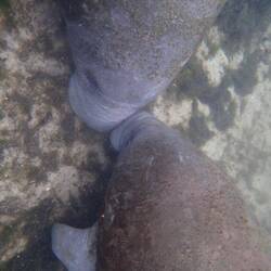 Zuerst sehe ich nichts ausser grünlichem Wasser. Ich bin noch etwas orientierungslos, als plötzlich ein riesiges Tier direkt unter mir auftaucht. Ich erschrecke! Ich wusste ja, dass Manatees gross sind, aber jetzt, nur etwa einen halben Meter unter mir, wird mir klar, wie gigantisch sie wirklich sind.