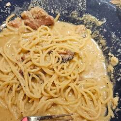 Die gegrillten Oktopus-Arme sind wirklich lecker, und auch Jänus Lasagne überzeugt – allerdings müssen wir fast eine Stunde auf unser Essen warten. Meine Carbonara hingegen ist eine herbe Enttäuschung. Die Sauce ist wässrig, und riesige Fleischstücke, die verbrannt schmecken, ruinieren das Gericht komplett.