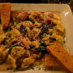 Die Vorspeise und der Drink sind ganz okay, aber die Hauptspeise – Shrimps Alfredo – ist enttäuschend. Ich versuche, wenigstens die Spaghetti ohne Sauce zu essen, aber nach ein paar Gabeln geht nichts mehr. Ich versuche zumindest die Shrimps zu essen.