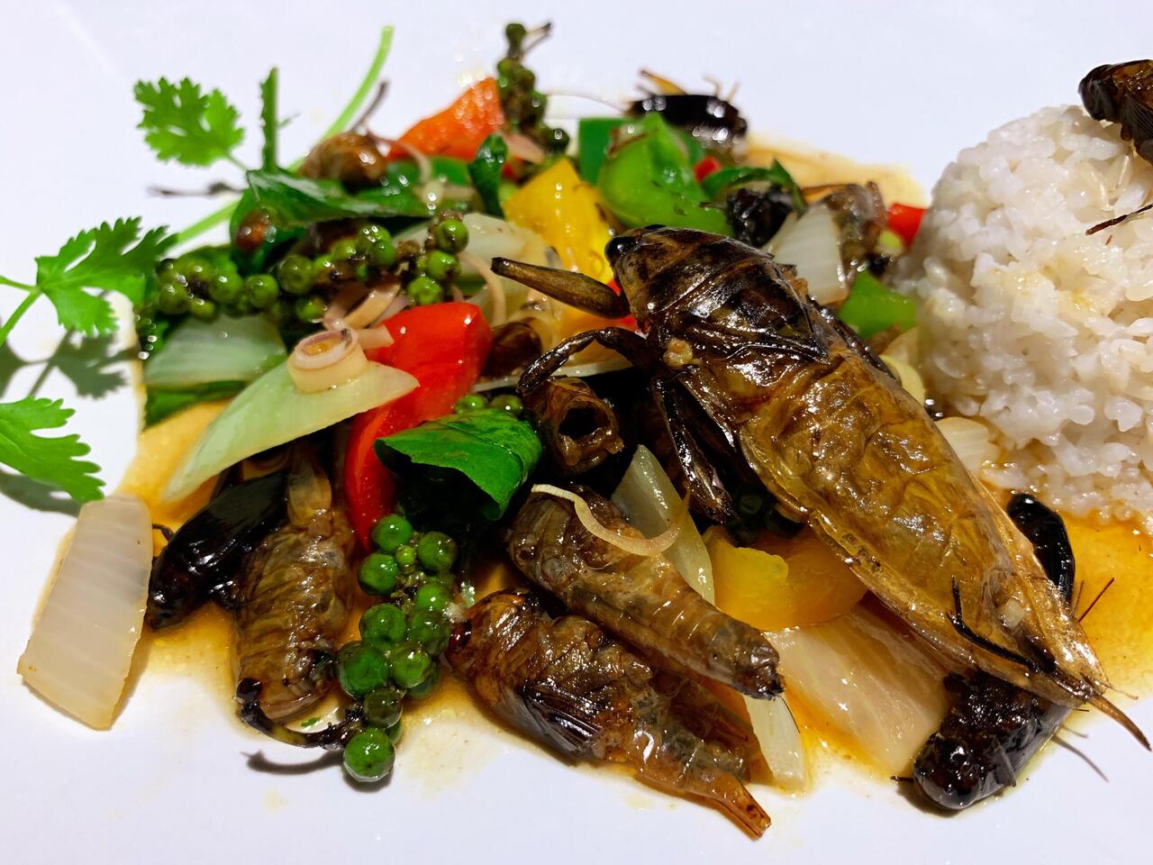 Crickets, silkworm larvae, grasshoppers, and a giant water bug. An upscale cafe (street bugs later, perhaps?) And then the power went out on the whole block.