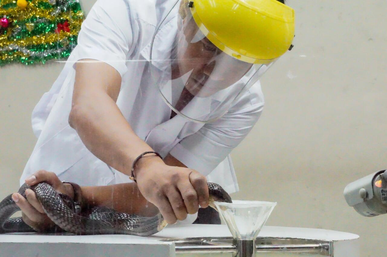 Extracting venom from the deadly Siamese (Monocellate) cobra in order to produce antivenom. The Siamese cobra’s venom contains a neurotoxin that causes more deaths than any other snake in Thailand.
