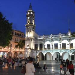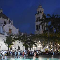Ein Abend auf dem Zocalo in Veracruz. Auf diesem Platz treffen sich die Leute und es findet trotz Covid ein fast normales Leben statt. Viele Leute tragen Masken, Hände desinfizieren und FiebermessenMeer informatie