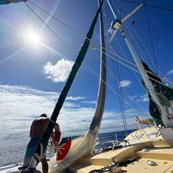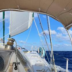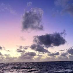 Im Morgengrauen nimmt die Windstärke ab und im Laufe des Vormittags pendelt sich der Wind bei 6-10 kt ein. Im zweiten Etmal haben wir 202sm zurückgelegt.