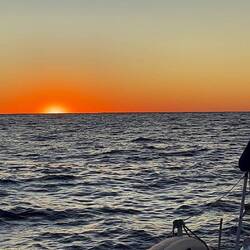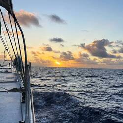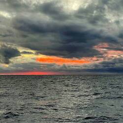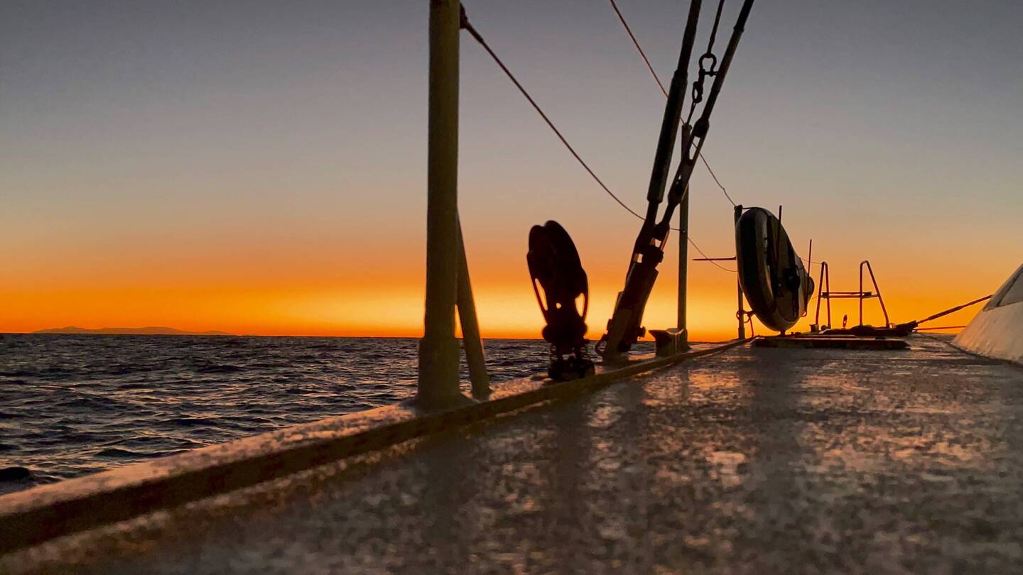 Der Sonnenaufgang in Achtern ist in meiner Wache um 06:00 Uhr farblich ein Genuss und der Tag beginnt mit rasanter Fahrt in Richtung Westen.