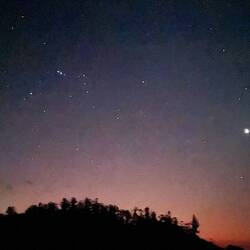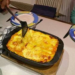 Abends gibt es Lasagne zu bewölktem Himmel und halben Mond.