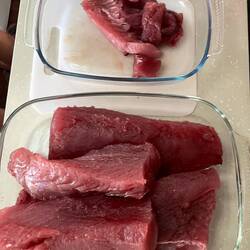 Reste von Kuchen, Gemüse und unser 17kg Gelbflossentunfisch werden zubereitet und verschnabbuliert bzw. eingefroren.
