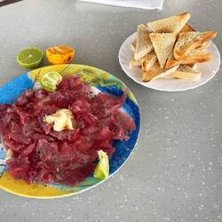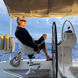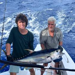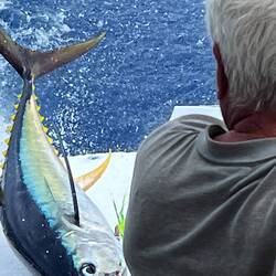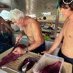 Es ist ein Gelbfossenthunfisch der in voller Fahrt angebissen hat und jetzt durch uns geborgen wird. Ein prachtvolles Exemplar von 1,20m Länge und 17kg Gewicht, für mich der größte jemals erbeutete Thunfisch auf meinen Segelreisen. Der Fisch wird sofort fachmännisch filetiert und ein frisches Sashimi nach einstündiger Arbeit serviert der Rest kommt portioniert in den Tiefkühlschrank.