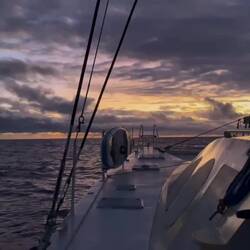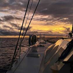Herzstillstand zum Sonnenuntergang, unsere Kurzwellenantenne zum Senden der Position in die Heimat und Empfangen der Wetterdaten ist am Steuerbordsaling abgerissen.