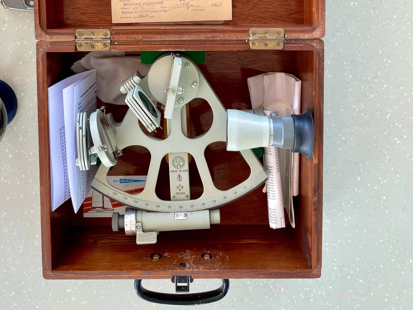 Der Sextant von der Freiberger Präzisionsmechanik stammt noch aus alten NVA-Beständen (Nationale Volksarmee der DDR) und wird nach fachkundiger Kalibrierung zur Mittagssonnenwende zum Einsatz gebracht.