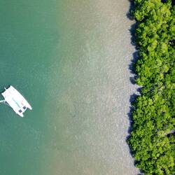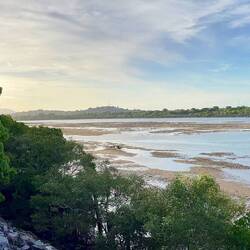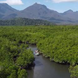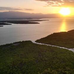 Der Daintree River schneidet einen hier einen Canyon durch den Regenwald und hat auf der einen Seite bergiges Gelände und an der anderen Seite seichtes Ufer mit Sandbänken und Mangroven.