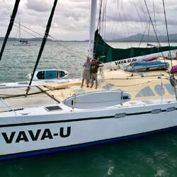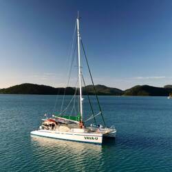 Die VAVA-U surft unter türkisfarbenen Himmel mit gereffter Genua und Großsegel bei 8kt Fahrt durchs Wasser in Richtung dem großen Barriereriff vor Australien.