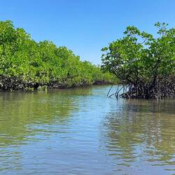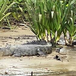 Gleich nach der ersten Biegung im Fluss nimmt der Bootsführer fahrt aus dem Schiff und was soll ich sagen, die Aufregung ist groß im leichten Aluminiumkahn als wir in 20m Entfernung unser erstes Salzwasserkrokodil in der freien Natur sehen. Es ist ein ca 4m großes Weibchen das sich in der Mittagssonne aufwärmt und ganz langsam zu uns herüberäugt.