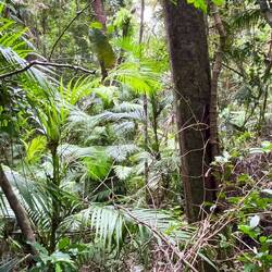 Auf der Rückfahrt nach Cairns besuchen wir noch die Kauri Bäume am Lake Barrine und staunen über die Zwillinge mit je vier Meter Durchmesser und 60 Meter Höhe an denen etliche verschiedene Baumfarne und andere Pflanzen in 40 Meter Höhe eine lebende Plattform entwickelt haben.