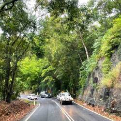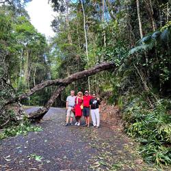 Gemeinsam fahren wir vier nach Kuranda im Norden von Cairns und besuchen dort die Barron Falls im Kuranda Rainforest Nationalpark. Auf der Strecke kurz vor den Wasserfällen versperrt uns ein Baum den Weg und alle Besucher stellen ihre Autos am Straßenrand ab und wandern die restlichen Kilometer durch den Dschungel bis zum Aussichtspunkt.