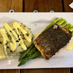 Zum Nachtessen im „The Court House“ gibts lokalen Barramundi, ein nur in Australien vorkommender Flussräuber mit sehr grossen Schuppen, sehr schmackhaft.