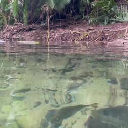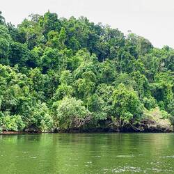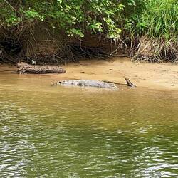 Die Zeit vergeht im Fluge und wir wenden auf dem Fluss für die Rückfahrt zum Ausgangspunkt. An uns zieht undurchdringlicher Bergregenwald vorüber und die Artenvielfalt an sichtbaren Bäumen und Pflanzen ist enorm bis an die Wasserkante. Die Krokodile liegen immer noch auf ihren Sandbänken sonnen sich jetzt von der anderen Seite.
