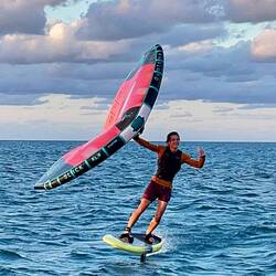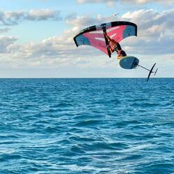 Jakob macht seinen Wing Foil startklar und zieht mehrere Bahnen vor der kleinen Sandbank die mit tausenden Seevögeln bevölkert ist.