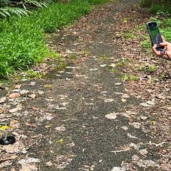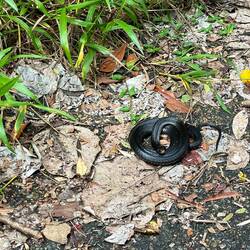 Auf dem Rückweg zum Lake Eacham sonnt sich am Wegesrand ein schwarze Schlange und zeigt uns damit an, wir sind und waren nicht allein im Regenwald. Dabei ging mir den Rest des Weges durch den Sinn, dass wir auf dem Trampelpfad nur mit Blattwerk und schlammigen Untergrund beschäftigt waren und unsere Aufmerksamkeit nichts weiter als die Farben Grün und Braun um uns herum wahrgenommen hat, über Tarnung der Jäger im Unterholz will ich garnicht nachdenken.