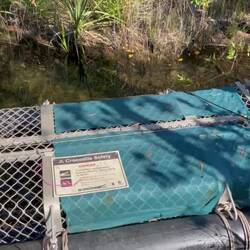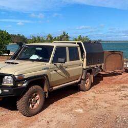 An der Rangerstation ist ein Campingplatz und ein Buschflugplatz mit Treibstofflager angeschlossen, an dem wir schwerste Offrodfahrzeuge von Toyota sehen, die mit allerlei Extras für das Outback bestückt sind. Watttiefe über einen Meter, Seilwinde vorn und hinten, Kurzwellenfunkantenne, GPS-Antenne, multifunktionale Anhäger mit Zeltaufbau, Dieselgenerator und Bootstransport, Motorsäge und der obligatorische Grill fast wie beim Militär.