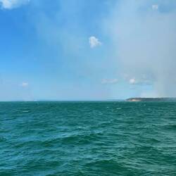 Der Weg dahin ist schnell zurückgelegt bei bis zu 11,5kt Fahrt unter Segeln. Hier spielt die VAVA-U bei 23kt Halbwind voll ihre Stärken aus und schneidet durchs Wasser, gefühlt wie ein Regattasegler. Der Wind kommt aus Osten und weht riesige Rauchschwaden von den taktisch gelegten Buschbränden im Aborigines-Stammesgebiet zu uns herüber. Wir haben dieses Schauspiel schon mehrfach aus der Ferne gesehen, doch diesmal sind wir in Sichtweite an den Brandherden und der Qualm färbt das Sonnenlicht Blutorange. Abends mit Einbruch der Dunkelheit und abflauen des Windes scheinen die Brände wieder gelöscht, denn Flammen sehen wir nachts nirgends in den Waldgebieten.