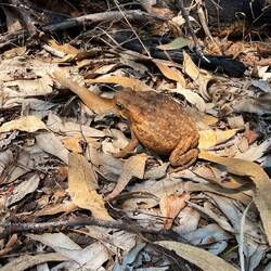 Auf dem Rückweg zum Schiff entdecken wir noch Spuren von Wasserbüffeln im Sumpf und eine Kröte die die Größe einer Ananas hat. Sie sonnt sich auf dem Weg, mit dem langen Stock ist auch diese aus dem Weg geräumt und bei näherer Betrachtung sehe ich noch eine Trichternetzspinne in ihrem Gespinnst auf der Lauer. Giftig oder nicht, ich traue mich nicht ganz nah heran, sie ist schwer zu fotografieren.