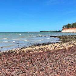Der Black Point, in Aboriginessprache Algarlarlgarl, hat seine Bezeichnung durch die gut sichtbaren großen schwarzen Felsen, die die hervorstehend Halbinsel abschließen und markieren. Wir gehen windgeschützt vor Anker und setzten mit dem Dinghi über. Von See aus entdeckten wir einen Sendemast und Lastenkran, also kann die Rangerstation nicht weit entfernt sein.