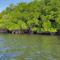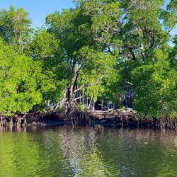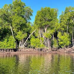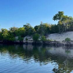 Danach eine Ausfahrt mit dem Dinghi in die nahe Flußmündung am Sandstrand. Dieser Seitenarm eines Mangrovengebietes ist zum ersten Mal in Australien mit klarem Wasser gefüllt. Eine riesige Sandbank am Eingang schirmt diesen Mangrovenarm gegen die Gezeiten perfekt ab und wir müssen gut navigieren um nicht aufzusitzen. Das Wasser ist nicht ganz so salzig wie der Ozean und die Mangroven sind riesig bis zu 15m hoch. Die Fische spritzen rechts und links vom Boot weg und die Vögel kündigen unser Ankommen für die anderen im Busch an. Alles in allem eine Augenweide hier in dem Mangrovenwald unsere Bahn zu ziehen, Krokodile haben wir nicht gesichtet.